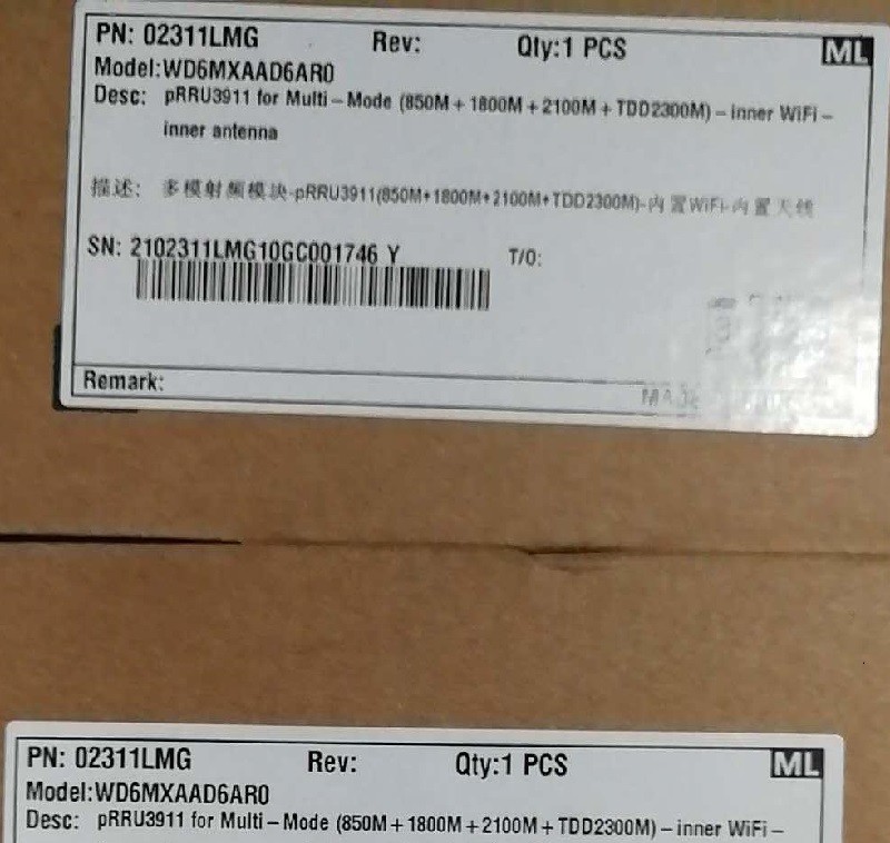 02311RXD Multimode Radio -pRRU3911(850M+1800M+2100M)- Inside WiFi- Inside Antenna Spare Parts pRRU3911-WD6MYAAD6BC0-LampSite(TX869~894MHz/RX824~849MHz,TX1805~1880MHz/RX1710~1785MHz,TX2110~2170MHz/RX1920~1980MHz,PoE,1.25G,2T2R*3,3*200mW, Inside WiFi, Inside Antenna )